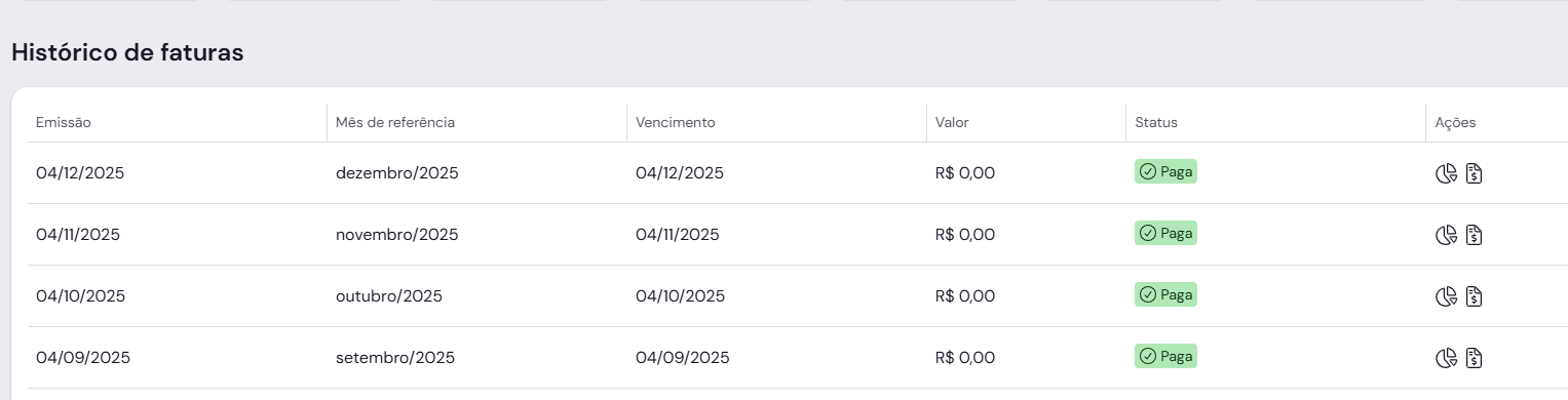 Você pode encontrar as notas fiscais através da plataforma acessando a área de “Configurações”, na aba “Plano e Cobrança”. No Histórico de cobrança é possível “Visualizar” os pagamentos e as notas fiscais, além de ver o “Consumo” do mês em questão.