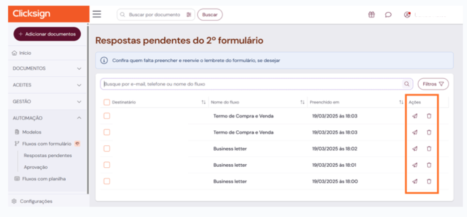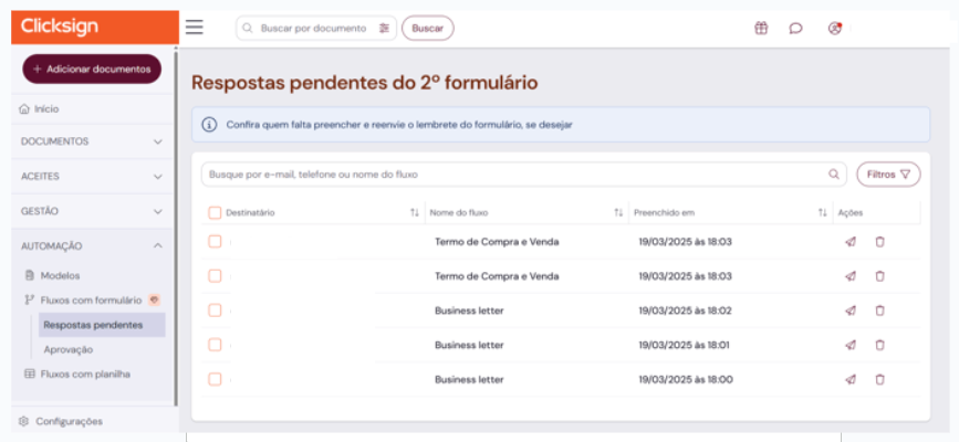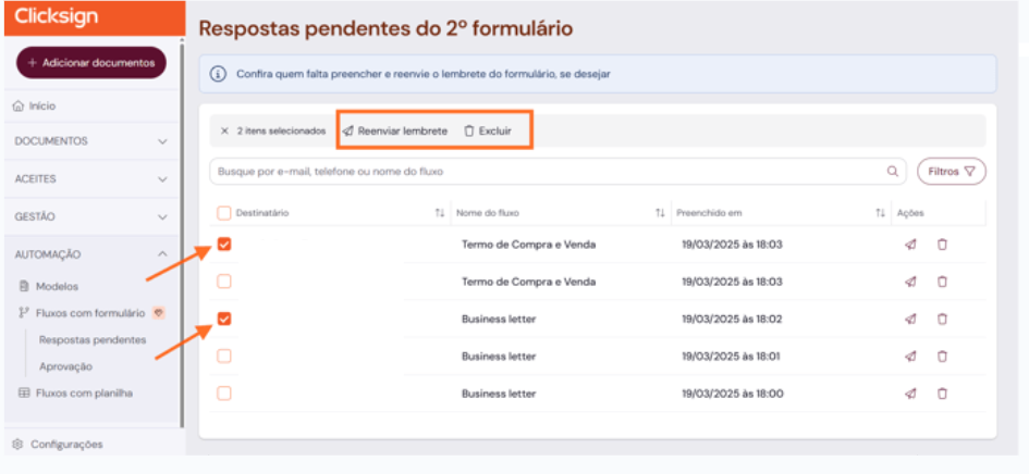 Selecione mais de um fluxo para enviar lembretes ou excluir pendências de uma só vez.