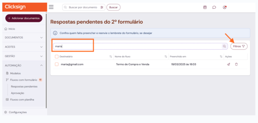 - Pesquise pelo e-mail do signatário, número de celular (caso tenha sido enviado via WhatsApp) ou nome do fluxo.
