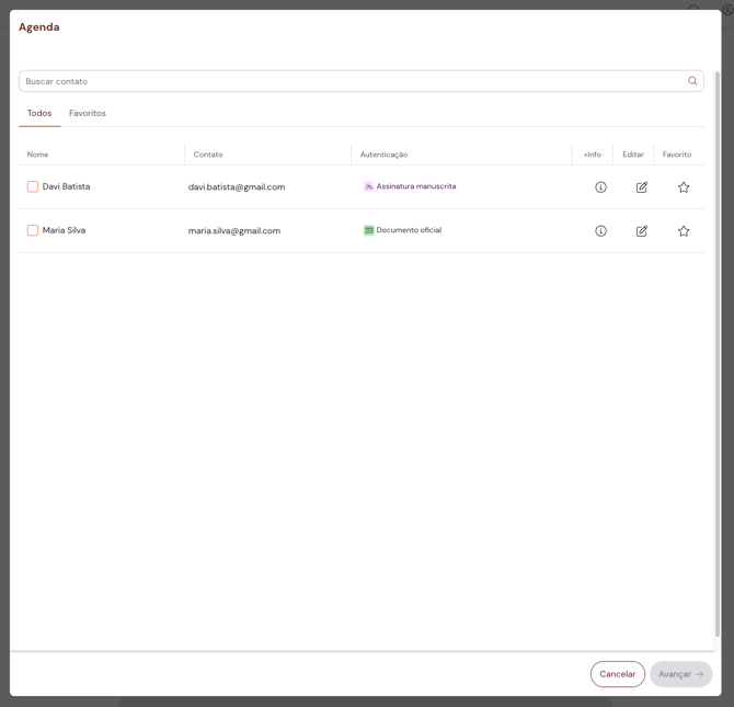 2. Você visualizará uma tela em que poderá visualizar os contatos que você já possui cadastrados em sua agenda, para selecioná-los