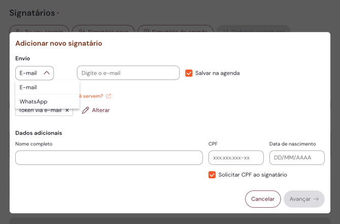 Durante a etapa de Adicionar signatários, ao clicar em Signatário novo ou Signatário da agenda você poderá alterar a forma de envio do documento para assinatura.