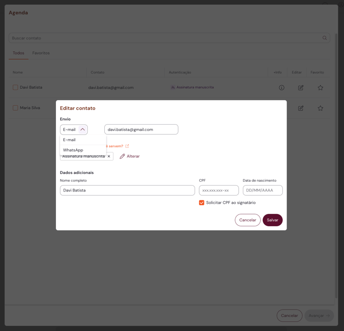 2. Você visualizará uma tela em que poderá informar o método de envio do documento: E-mail ou WhatsApp.