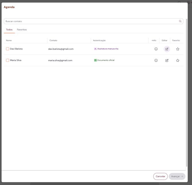 3. Para editar o método de envio do documento para algum dos signatários cadastrados, é só clicar no ícone de lápis, na seção “Editar"