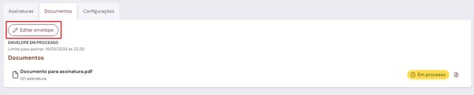 Na aba "Documentos", ao clicar no envelope, você poderá incluir ou remover documentos ou signatários do processo de assinatura, basta clicar em "Editar envelope".