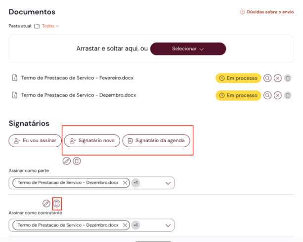 Clique em "Avançar", ainda na edição do envelope, e inclua novos signatários ou diretamente da agenda, ou ainda remova-os clicando no ícone de lixeira no signatário desejado.
