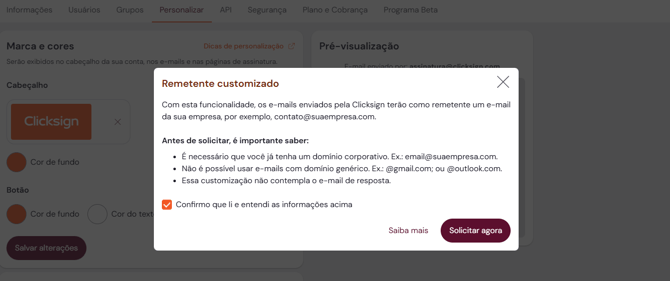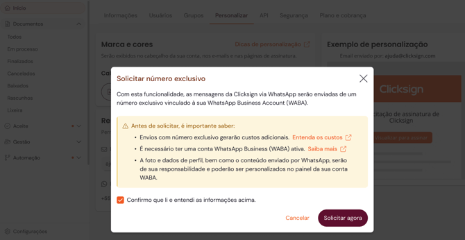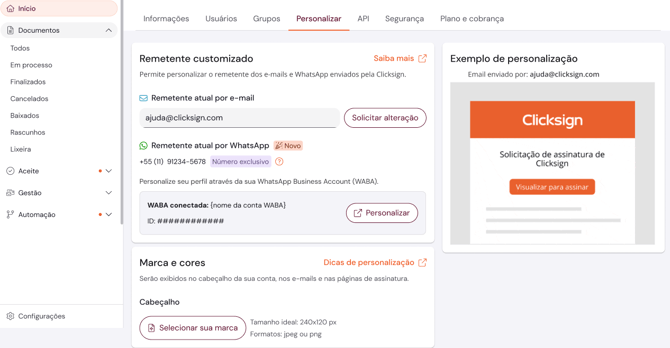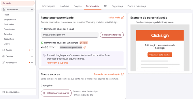 - Aceite Jurídico: A personalização do remetente se aplica apenas ao e-mail ou número que a mensagem é enviada. O documento de aceitação e log de auditoria mantém o padrão visual e jurídico da Clicksign.