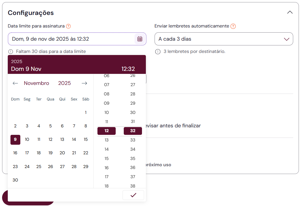 Por padrão, a data limite de assinatura é de 30 dias a partir do envio do documento. Porém, é possível diminuir essa data limite ou estender por até 90 dias.
