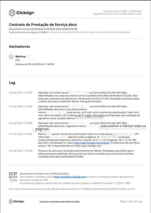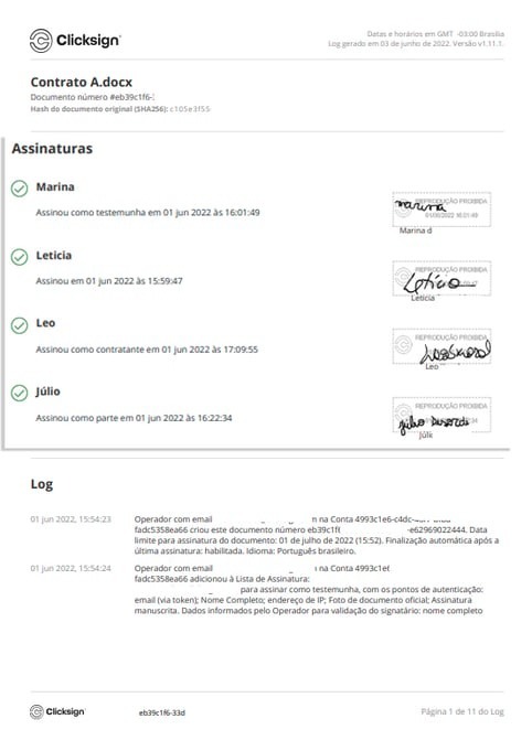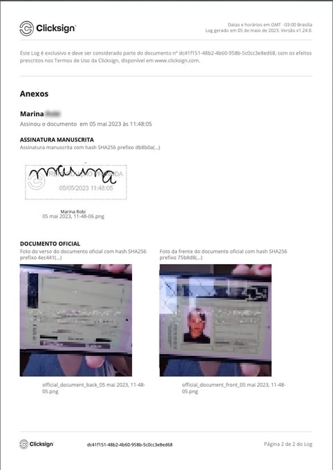 Na Clicksign, todos os documentos assinados possuem uma página anexa com o histórico completo das assinaturas. Essa página anexa é o Log do documento.