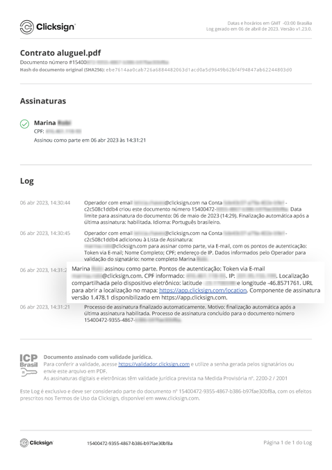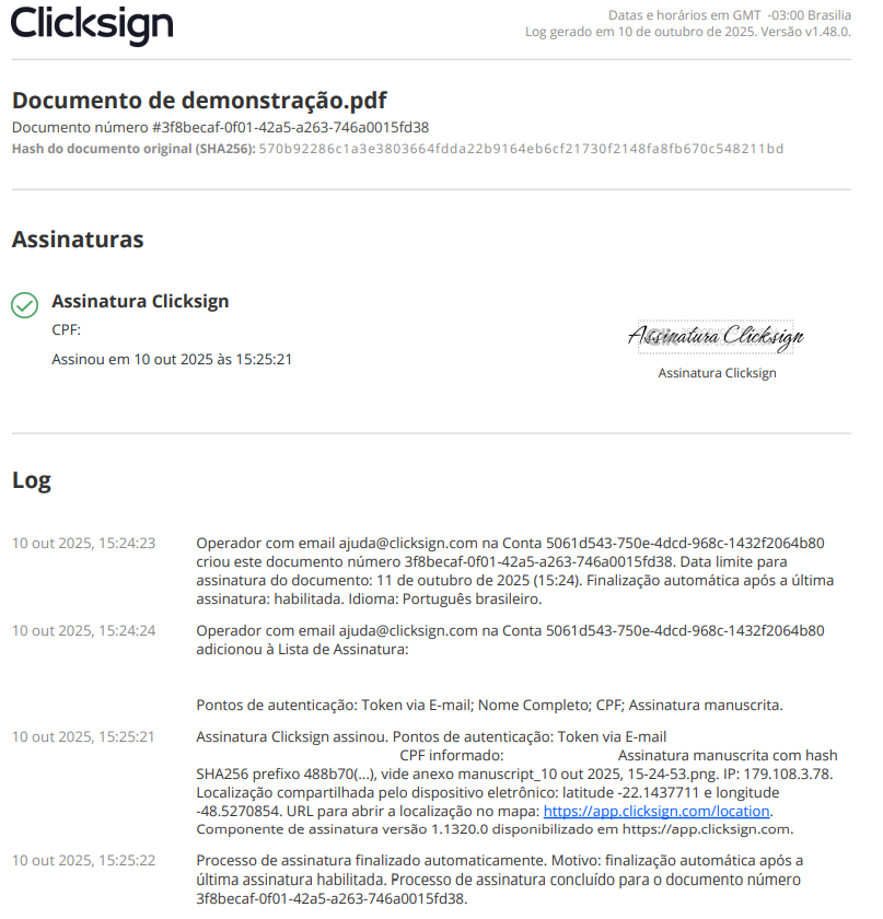 Caso o signatário (quem assina) tenha habilitado o compartilhamento de sua localização no momento da assinatura, suas informações de latitude e longitude estarão no Log do documento, assim como um link que permite visualizar a localização em um mapa.