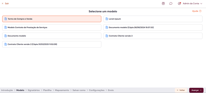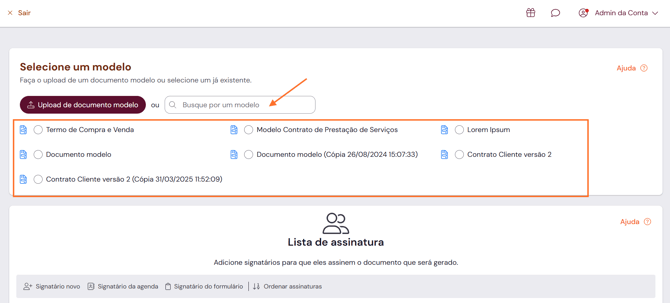 Antes de selecionar um modelo dentro do fluxo é preciso que esse modelo tenha sido criado na plataforma. Saiba mais em Como criar um modelo de documento?