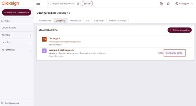 - Na aba "Usuários" clique em "Remover da conta" o usuário desejado e confirme em seguida, clicando em "Remover".