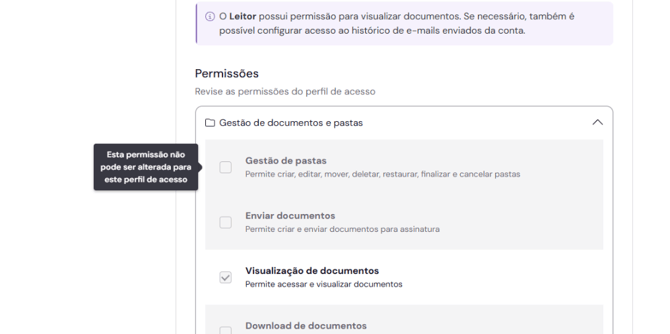 As permissões exibidas são herdadas desse perfil pré-definido, por isso aparecem apenas para leitura.