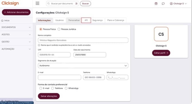 - Em "Configurações", no menu lateral, clique em "API"