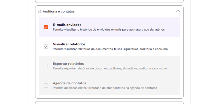 Elas são organizadas por módulos, como "Gestão de documentos e pastas", "Auditoria e contatos" e "Administração e conta" e o usuário pode clicar no cabeçalho de cada grupo para visualizar a lista detalhada de permissões que compõem aquele perfil.