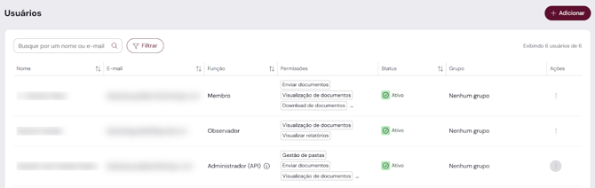 A adição ou remoção de usuários está habilitada apenas para usuários com permissão Administrador.
