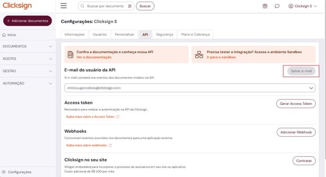 - Em "E-mail do usuário da API" selecione um novo e-mail e clique em "Salvar e-mail"