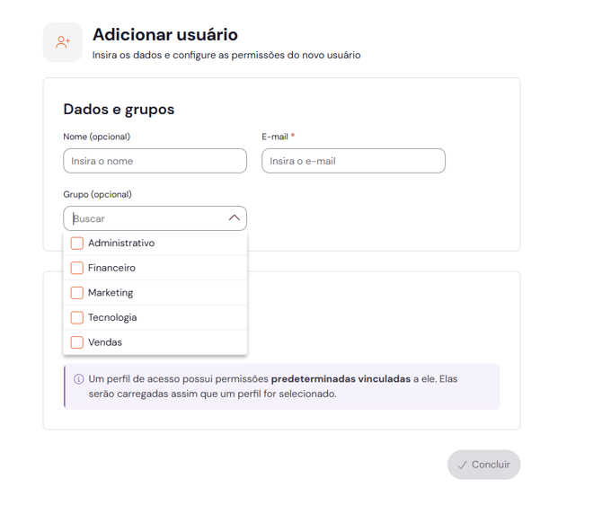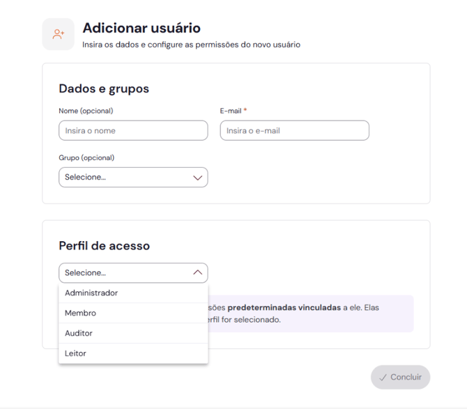 Ao selecionar um Perfil de Acesso para o novo usuário (por exemplo, Membro), a seção de Permissões é carregada automaticamente.