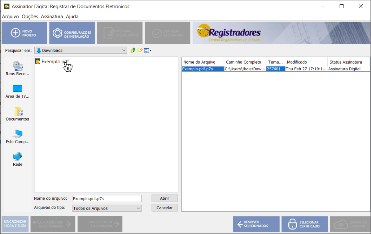- Busque e selecione o arquivo P7S do documento assinado na Clicksign em seu computador.