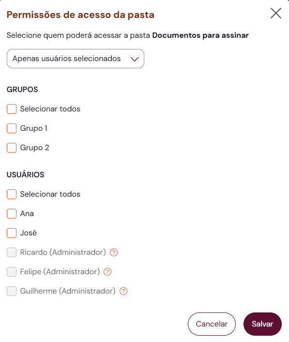 Usuários administradores sempre vão ter acesso às pastas, por isso não é possível selecioná-los.