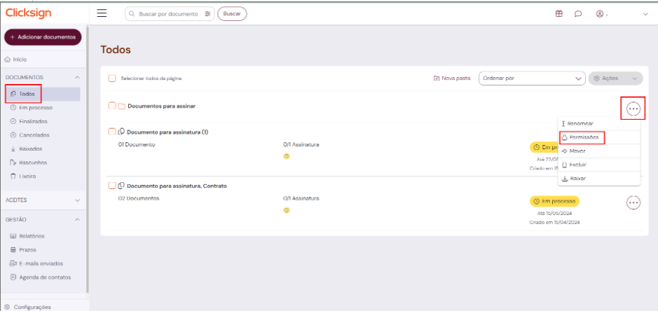 1. No menu lateral, aba "Documentos", clique em "Todos". Ao passar o cursor por cima da pasta desejada, um botão de "Permissões" ficará visível. Clique nele.