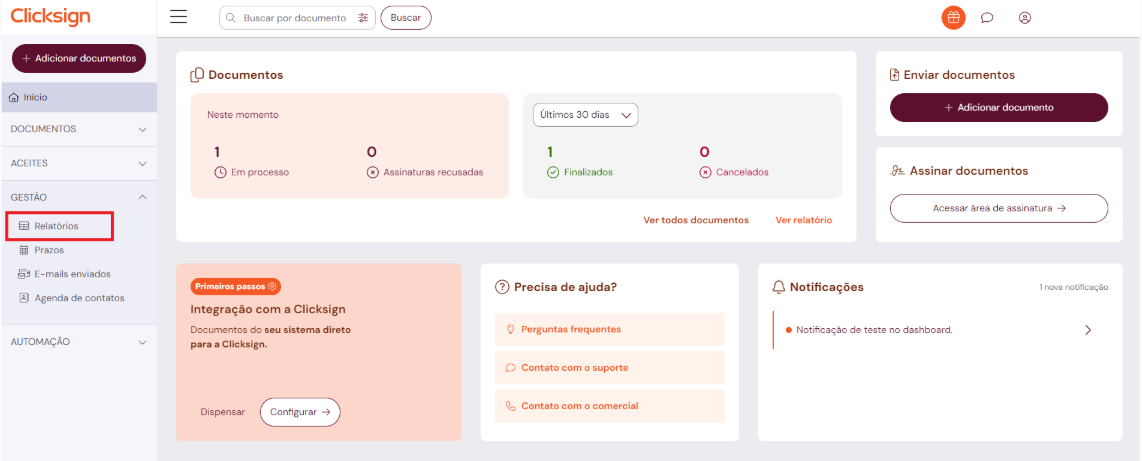 Clique em "Relatórios", na aba "Gestão" no menu lateral.