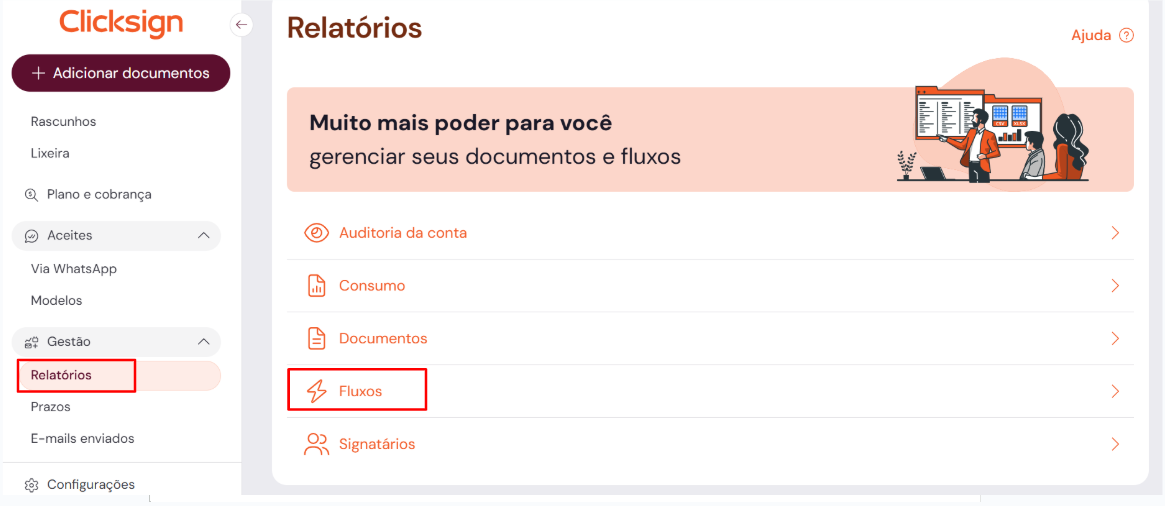 1. No menu lateral, aba "Gestão", clique em "Relatórios" e, depois, "Fluxos".