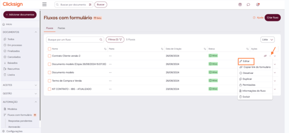 Em "Fluxo com formulário" no menu lateral, na aba "Automação", clique em "Opções" e "Editar", no fluxo desejado.