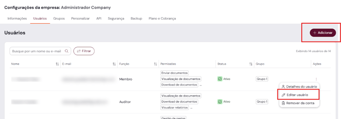 O processo para adicionar um usuário financeiro deve ser feito pelo usuário Administrador da conta. Somente ele pode adicionar, editar permissões ou ainda remover usuários.