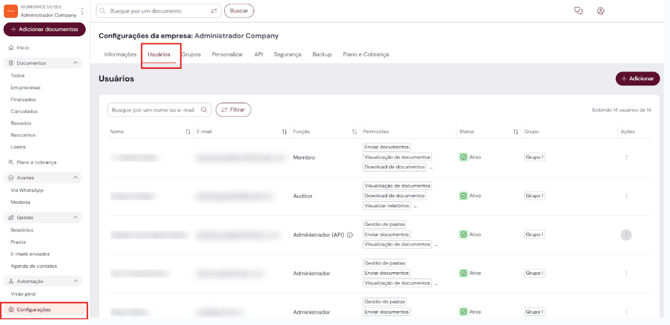 1. Clique em "Configurações" no menu lateral e acesse a aba "Usuários".