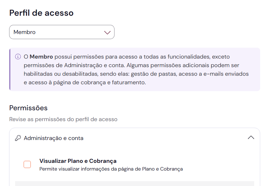 4. Você também pode dar um acesso de visualização para ações de cobrança. Neste caso, clique para adicionar a função de “Visualizar Plano e Cobrança” dentro das opções de Administração de conta para usuários do tipo “Membro”.