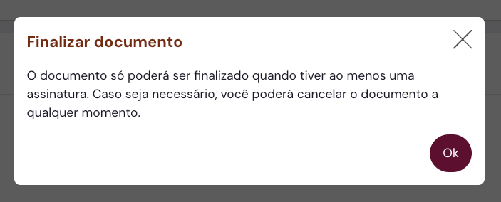O documento só poderá ser finalizado se tiver ao menos uma assinatura feita.