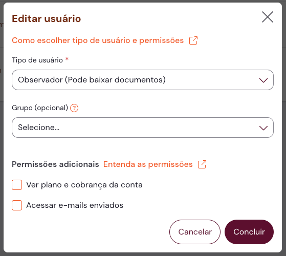 2. Crie um novo usuário ou edite um usuário existente, marcando a opção Acessar e-mails enviados, finalizando em Concluir: