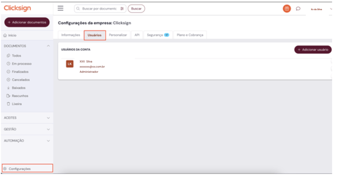 - Clique em Configurações no menu lateral e em seguida na aba Usuários: