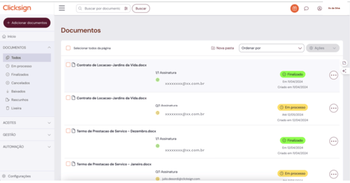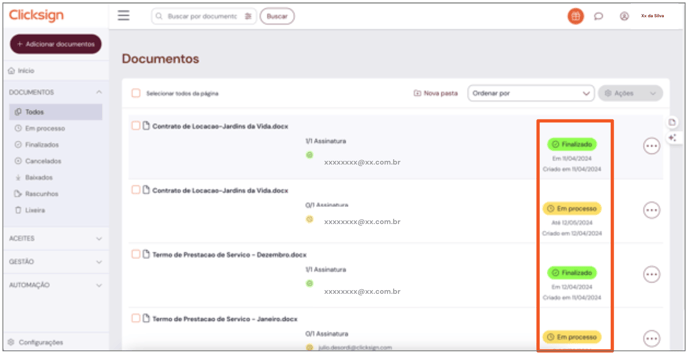 - Enviado: documentos que já foram enviados e estão aguardando assinatura;