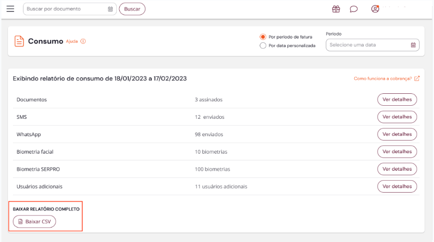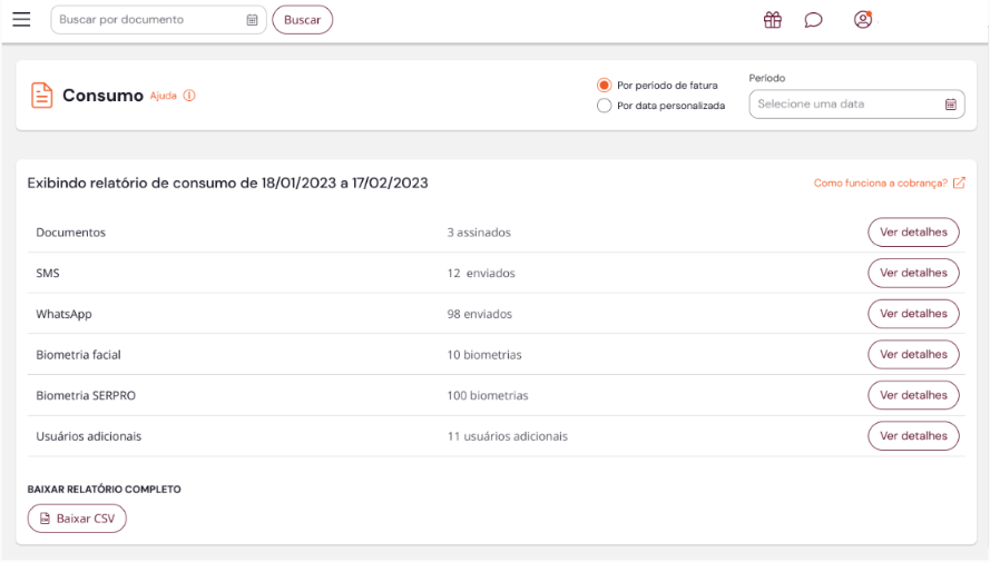 2. Nesta tela, é mostrado um resumo completo de todas as funcionalidades adicionais ao plano utilizadas no período selecionado, além do total de documentos finalizados dentro de um período específico. Escolha se deseja consultar o consumo por período de fatura ou por data personalizada.