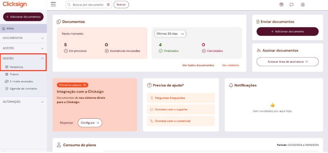 1. No menu lateral, aba "Gestão", clique em "Relatórios". Depois, acesse a opção “Consumo”.