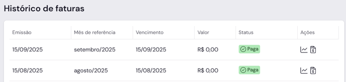 Em Configurações, na aba Plano e Cobrança, é possível acessar seu Histórico de Faturas. Neste ambiente você visualizará não só as faturas, mas também as notas fiscais relativas à sua conta.