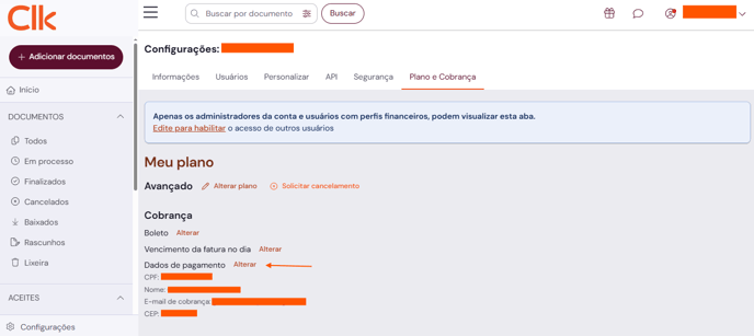 Na seção Cobrança, clique em Alterar para editar os dados de cobrança. Somente administradores podem visualizar e utilizar essa opção.