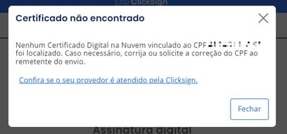 Além disso, o motivo para o certificado não ter sido encontrado é que o provedor não é atendido pela Clicksign. Atendemos os seguintes provedores:
