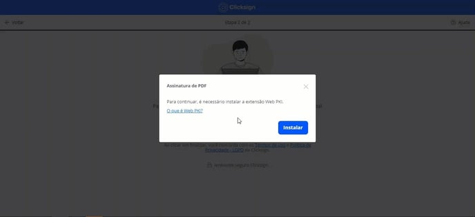 3. Para assinar com Certificado Digital no computador é necessário ter instalado a Web PKI, componente que suporta a assinatura com Certificado Digital no computador. Caso não possua, basta clicar em Instalar, e seguir as instruções na tela.
