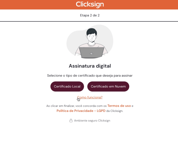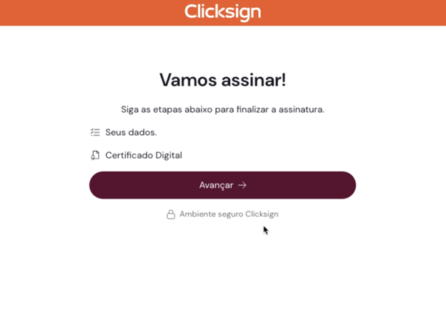 É possível que você precise utilizar seu certificado digital para concluir a assinatura de seu documento, basta seguir as instruções na tela.