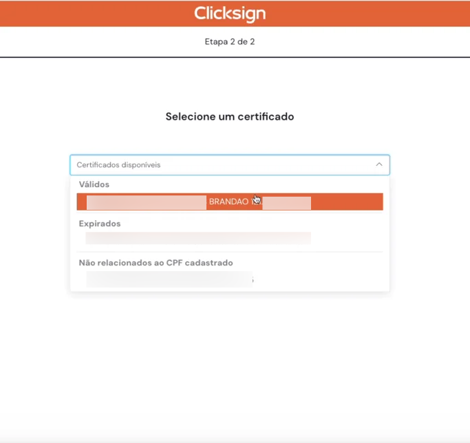 Caso haja em seu dispositivo um Certificado que não corresponde com seus dados, a plataforma irá mostrá-lo, mas não será possível utilizá-lo para assinatura.