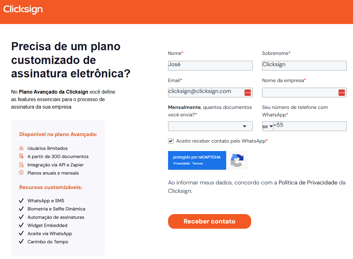 - Experiência White-label: O processo de assinatura é totalmente personalizado com a sua marca, cores e remetente, sem menções à Clicksign.