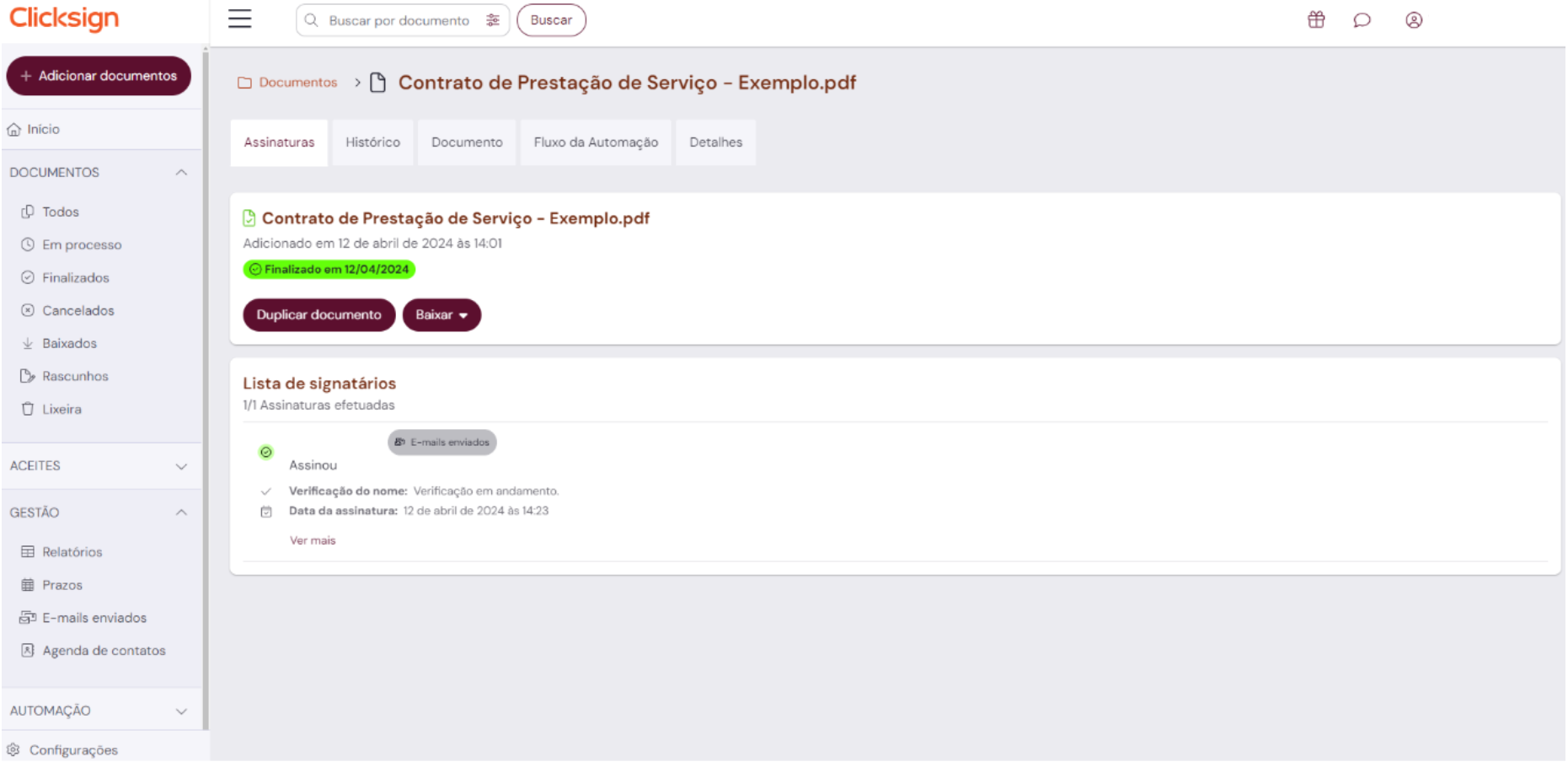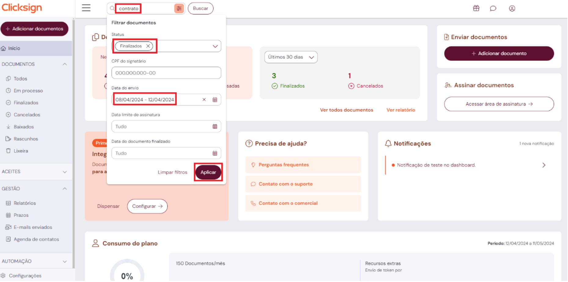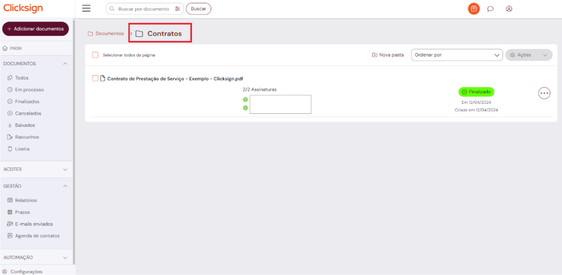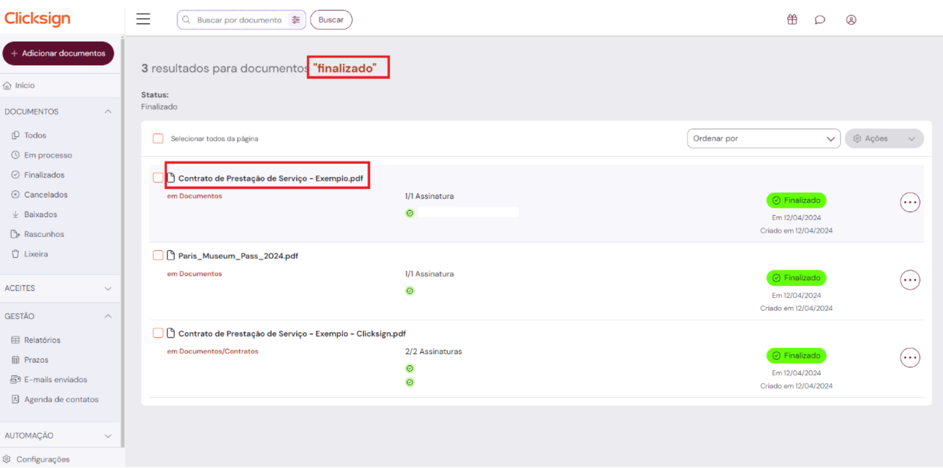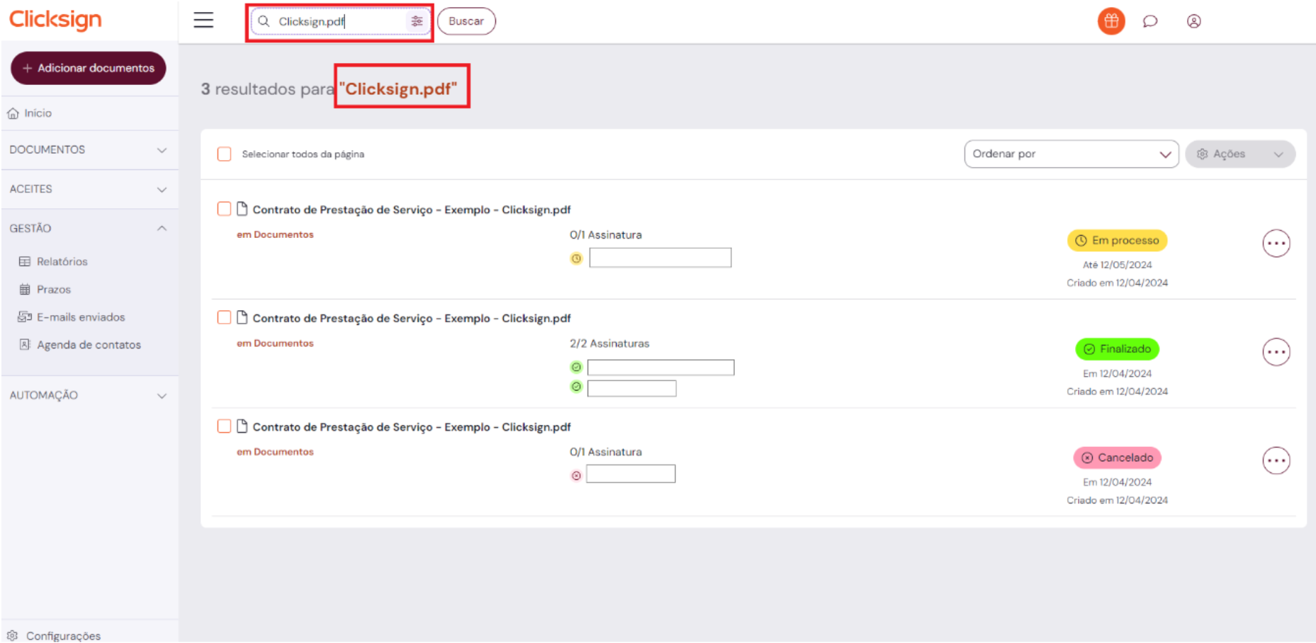 É permitido buscar por: nome do documento, nome ou e-mail do signatário.