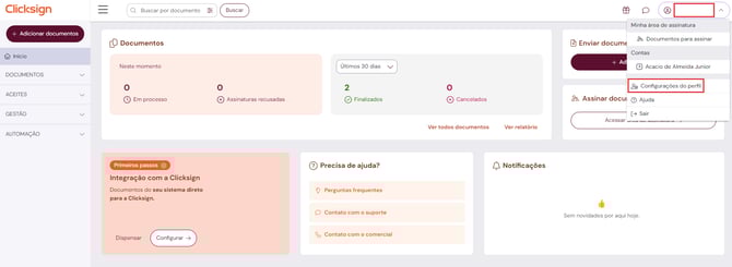 1. Acesse a aba com seu nome, no canto superior à direita, e depois clique em "Configurações do perfil".