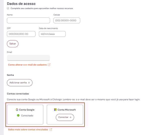 A vinculação de contas facilita o seu processo de acesso à plataforma da Clicksign. Conectando as contas, é possível logar na plataforma em apenas um clique, sem a necessidade de logar via e-mail e senha.