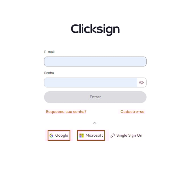 Depois da vinculação efetivada é só logar na Clicksign utilizando sua conta Google ou Microsoft, desde que esteja logado em seu navegador ou faça login no momento.