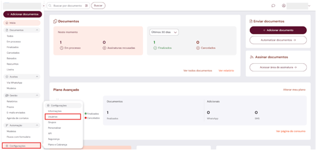 1. Em "Configurações", acesse a aba "Usuários".