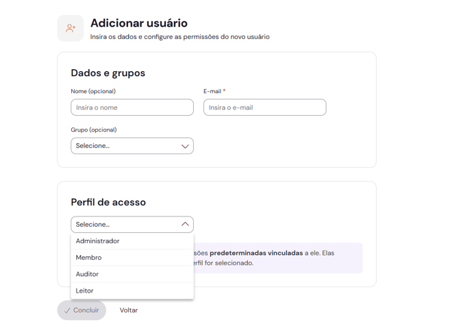 3. Defina o tipo de usuário para o novo endereço e depois aceite o convite recebido por e-mail no endereço fornecido.