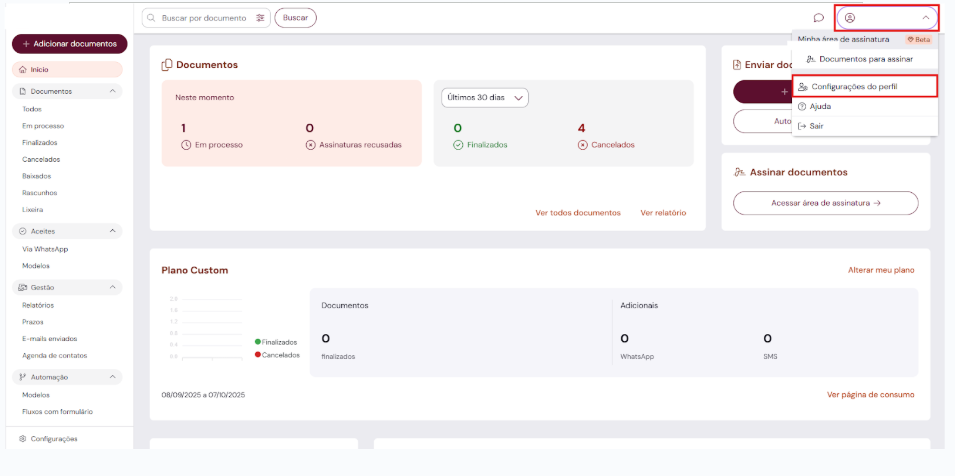 - Em sua conta, clique em seu nome, no canto superior direito, e acesse as “Configurações do perfil”;